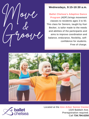 This Move and Groove class for Seniors, taught by Kari Becker, is tailor made to the needs and abilities of the participants and aims to improve coordination and balance, endurance, flexibility, self-confidence and, for students, teamwork. Located at the Ann Arbor Senior Center, 1320 Baldwin Ave. Preregistration required. To register, click here or call 734.794.6250. Free of charge.