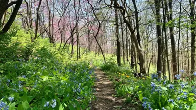 Cedar Bend brings to life a forest of pre-settlement times. Tall oaks and hickories surround you. Flowering black cherries and dogwoods highlight spring; native wildflowers bloom spring through fall; and flocks of chickadees, nuthatches, and titmice enliven the quiet beauty of the winter woodland. The trails offer a birds-eye view of the river and other areas of the city. There is a perennial garden maintained by a park neighbor at the top of the park, off Cedar Bend Drive. A mowed field is also in this section of the park.