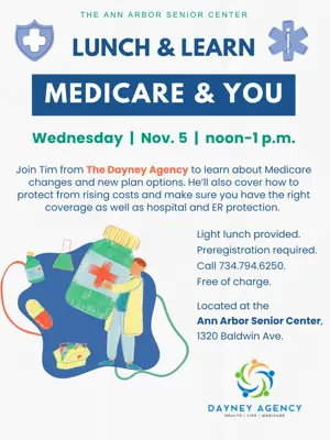 Join Tim from The Dayney Agency to learn about Medicare changes and new plan options. He’ll also cover how to protect from rising costs and make sure you have the right coverage as well as hospital and ER protection. Light lunch provided. Located at the Ann Arbor Senior Center, 1320 Baldwin Ave. Preregistration required. Click here to register or call 734.794.6250. Free of charge.
