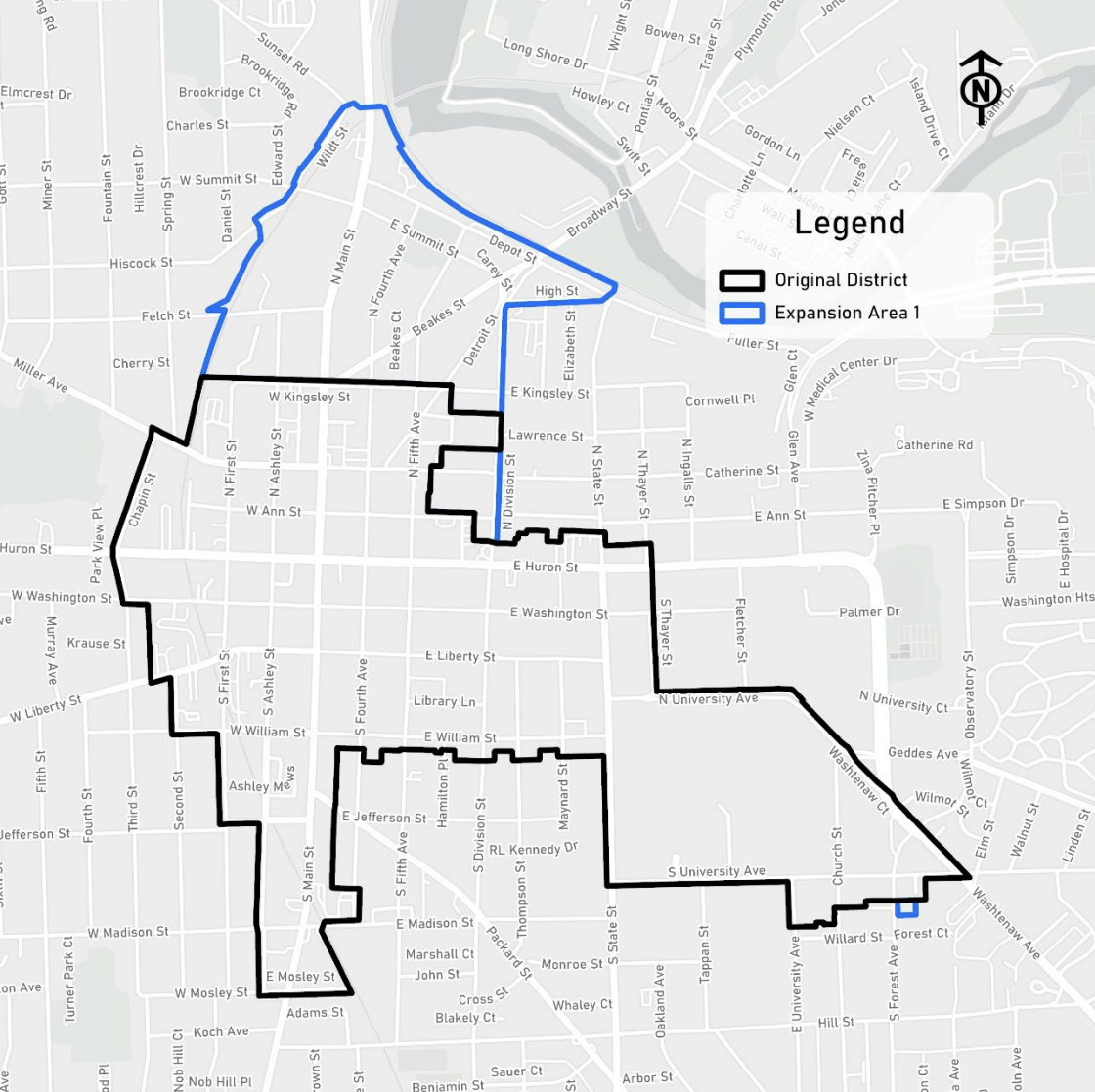 This is the first time the Ann Arbor DDA’s boundary has expanded since its creation in 1982. The 19-block expansion to the north unlocks opportunities to strengthen downtown’s connections to the Huron River and the northside of Ann Arbor. The expansion will also allow the Ann Arbor DDA to be involved in the enhancement of two major gateways into downtown, North Main Street and the Broadway Bridge.