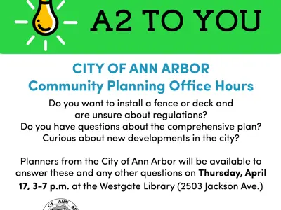 Spring is often the season when projects begin to bloom — from home construction and renovations to larger-scale developments. Just in time, the City of Ann Arbor Planning Services Department is inviting the community to an expanded office hours event. A2 to You: Community Planning Office Hours will take place at the Ann Arbor District Library Westgate Branch (2503 Jackson Ave.) 3–7 p.m. Thursday, April 17. City planners will be on hand, ready to interact and answer questions, at tables near the library’s circulation desk. The event is open to the public, free and with no need to preregister.