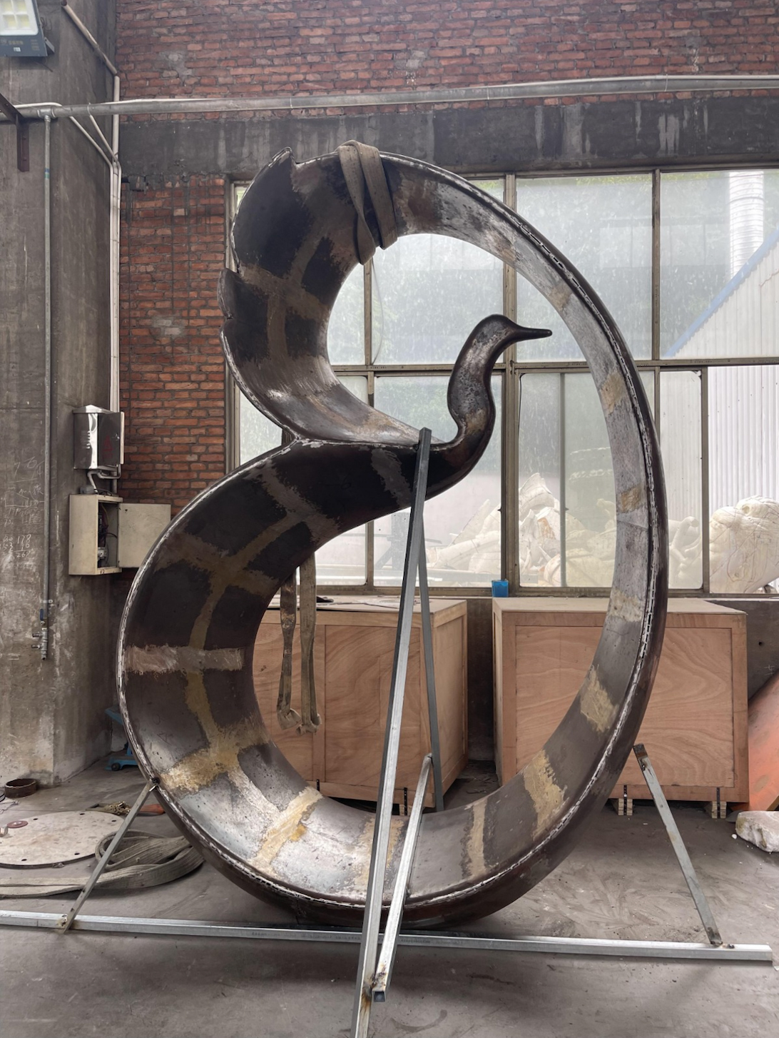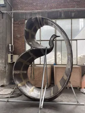 “Guardians of the Huron River” was designed and fabricated by Gavin and Kelley Brodin, the husband-and-wife team behind Formed For, a Los Angeles–based studio known for large-scale works that merge art, architecture and storytelling. The sculpture takes the form of an abstracted egret — long associated with patience, grace and the vitality of waterways. Rising in a continuous curve, the piece evokes the flowing movement of the river while framing the surrounding landscape. Both delicate and commanding, the work serves as a reminder of the fragile balance between human activity and the ecosystems that sustain life.