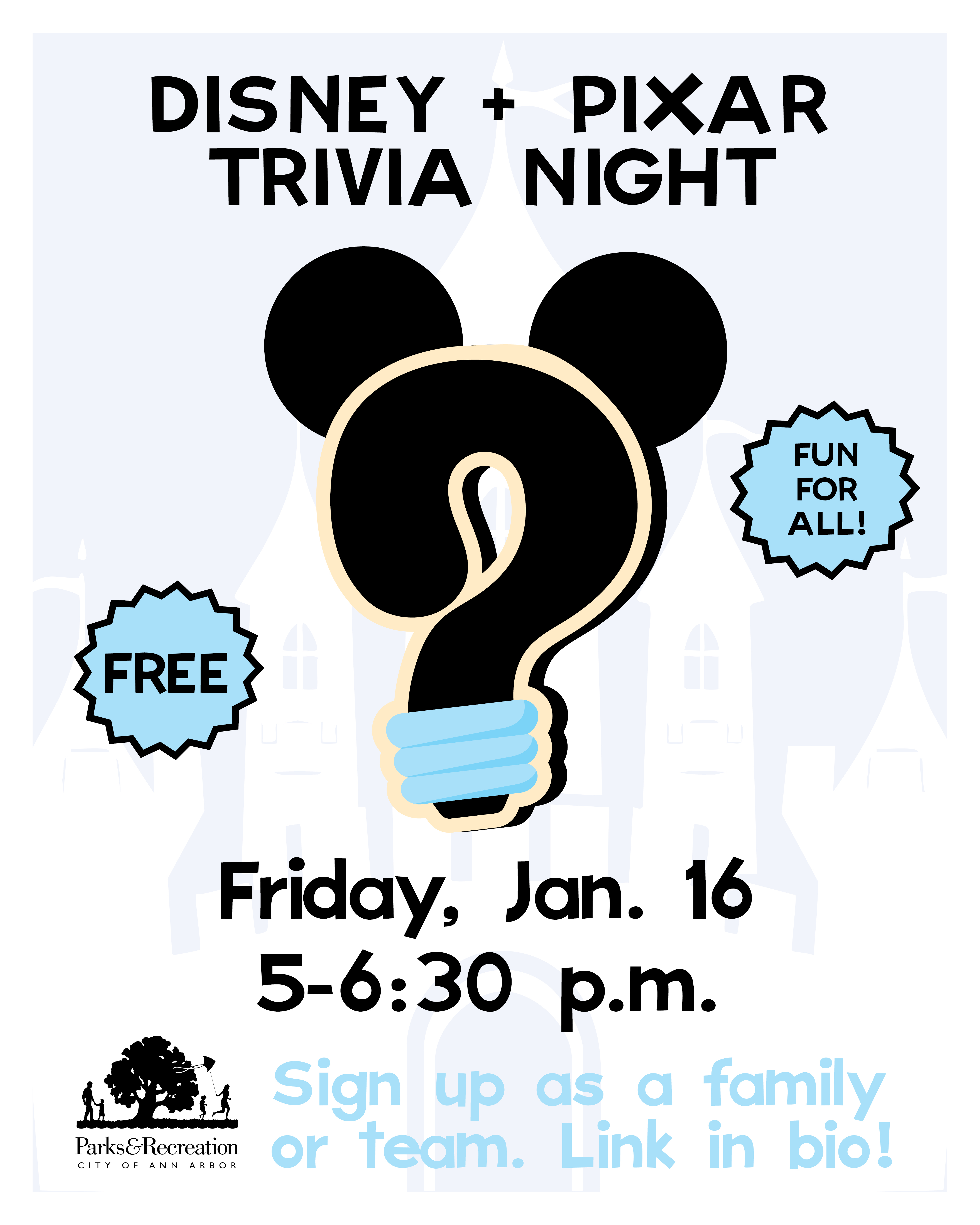 Looking for a fun family game night? Come play trivia with us! This evening will be all about Disney and Pixar questions. It's sure to be a good time for kids and the adult kids at heart!