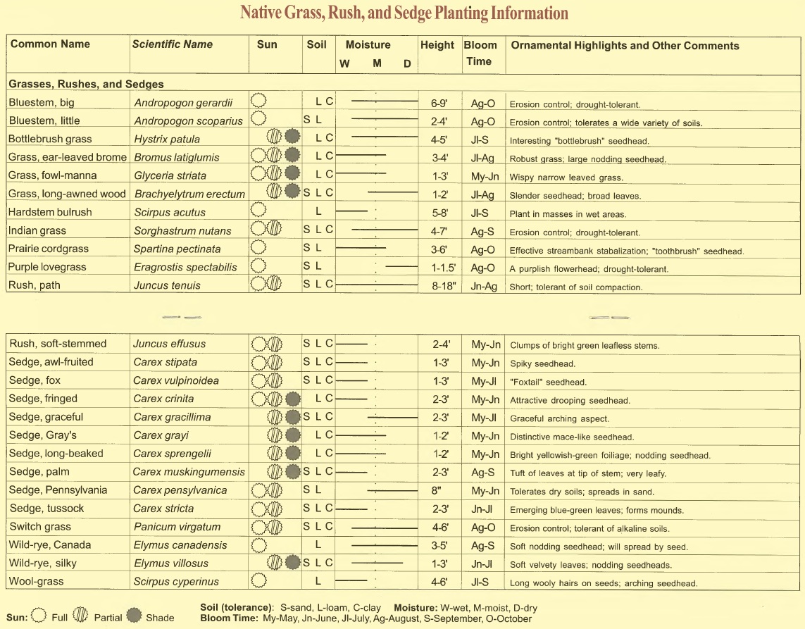 Prairie cordgrass (Spartina pectinata)Prairie cordgrass is a primary grass of the Midwestern tallgrass prairies where it prefers wet soils and full sun. The roots of this species may extend as deep as 10', making it difficult to move once established. It grows to 6' tall in ideal conditions and aggressively spreads by many strong rhizomes. These rhizomes bind soil very effectively, and may crowd out other less aggressive species. Spartina is a good selection to protect against erosion in areas such as riverbanks where soils are expected to be wet. It is drought-tolerant once established, and in dry gardens will spread more slowly, rarely reaching more than 3' tall. This species has sharp-edged, glossy, green leaves that arch gracefully and ripple beautifully in the wind; handle them carefully to avoid being cut. The leaves turn golden-yellow in the fall and hold their graceful arch, creating a pretty picture even in winter. This grass is best used next to water where it can provide good wildlife habitat. The tough blades were used as thatch and fuel by Native Americans and pioneers. This plant should be propagated by rhizomes, as viable seed production is rare. The seeds are borne on one side of the stem like a toothbrush and this distinctive seedhead is effective in both fresh and dried arrangements.