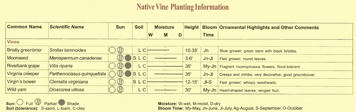 Moonseed (Menispermum canadense)Moonseed is a semi-woody species that typically grows in deciduous woods and swamp forests where soils are rich and evenly moist. It is also flood-tolerant. This vine scrambles on the ground or climbs on trees and shrubs by twining its stem around other twigs and stems. Its roundish, bright green leaves turn yellow in autumn. The blossoms appear in white clusters June through July and turn into blue-black fruit that matures in September. Songbirds, game birds, and small mammals quickly devour the berries. Moonseed requires both male and female plants for fruiting. It will spread by underground runners and may be considered weedy by some in urban settings. This is a vine for wild woodland gardens.
