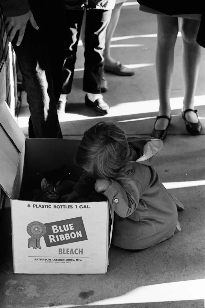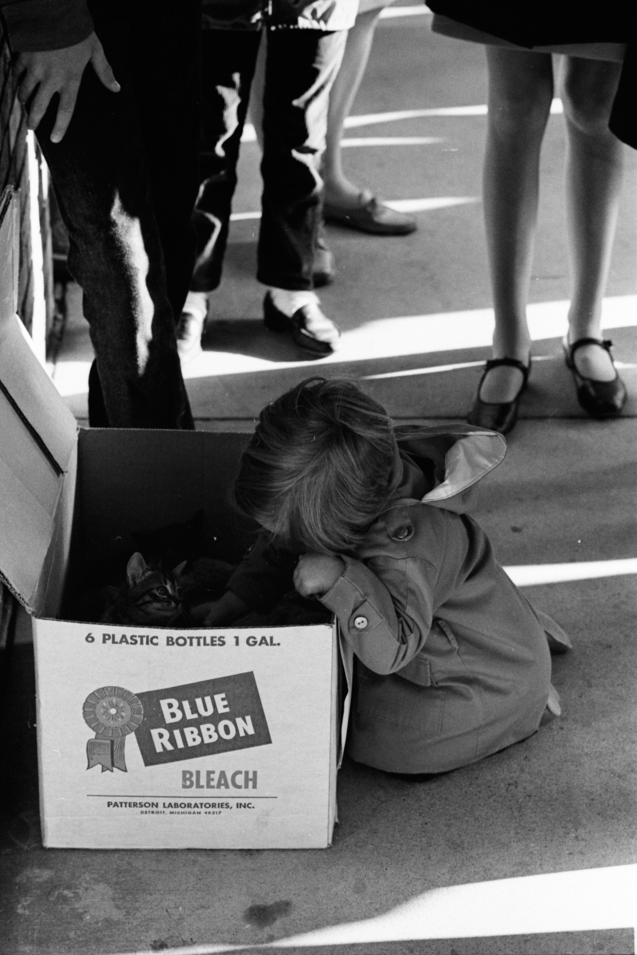 Caption: Mommie, Please?: Playful kittens, especially when they're homeless and free, are just too much for a little girl to pass by. Even though Mary Kay Lininger has kittens of her own at home, she made a noble attempt at trying to convince her mother that just one more wouldn't be too many. Mary Kay is the daughter of Mr. and Mrs. Roger A. Lininger of Mt. Vernon Avenue