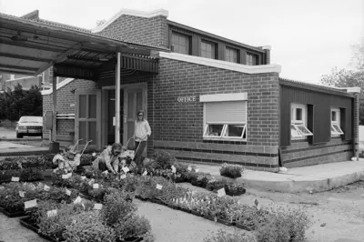 May 1984 Caption: The new Farmer's Market Office Building will open officially on Sunday at 1:30 p.m. with a ribbon-cutting ceremony. The building, in classic market style with small wings on either side, houses market offices and public rest rooms. The 1,100 square feet structure was designed by architect Kent Hubbell and cost about $148,000. That included preparing the site and landscaping. The ribbon-cutting will coincide with the market's Spring Festival, a tradition since 1900. In addition to the usual market activity magician Daryl Hurst will perform and music will be supplied by Dick Gorlitz and the Traditions. The festival runs from 11 a.m. to 5 p.m. The market is located on Detroit Street at Fourth Street.