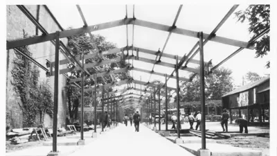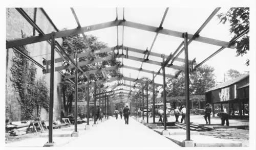 Pic: 1941 Farmers Market Under Construction. "From 1938 to 1940, the present 124-stall market was built by the federal Works Progress Administration, a Depression-era jobs program. WPA workers roofed and paved the market and added another short wing extending west from Detroit Street." - The Farmers Market Bounces Back, Grace Shackman. Photo courtesy of the Bentley Historical Library Sturgis Collection