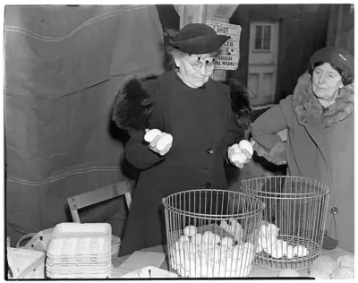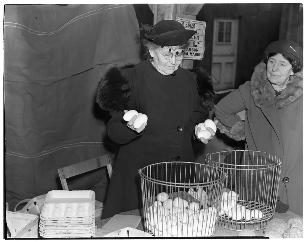 Photo: Mrs. Dieterle, Bob's Mother (1968). 'Winter was an even more trying time. Bob Dieterle didn’t miss a Saturday for fifty-seven years. "People depended on us to bring eggs,” he says. “Once when there was a big snowstorm, when we still had horses, I knew my dad’s ’34 Ford couldn’t reach the corner [to the main road], so I had the horses pull it there. I met him there with the horses when he returned at three.' - The Farmers Market Bounces Back, Grace Shackman, 1998