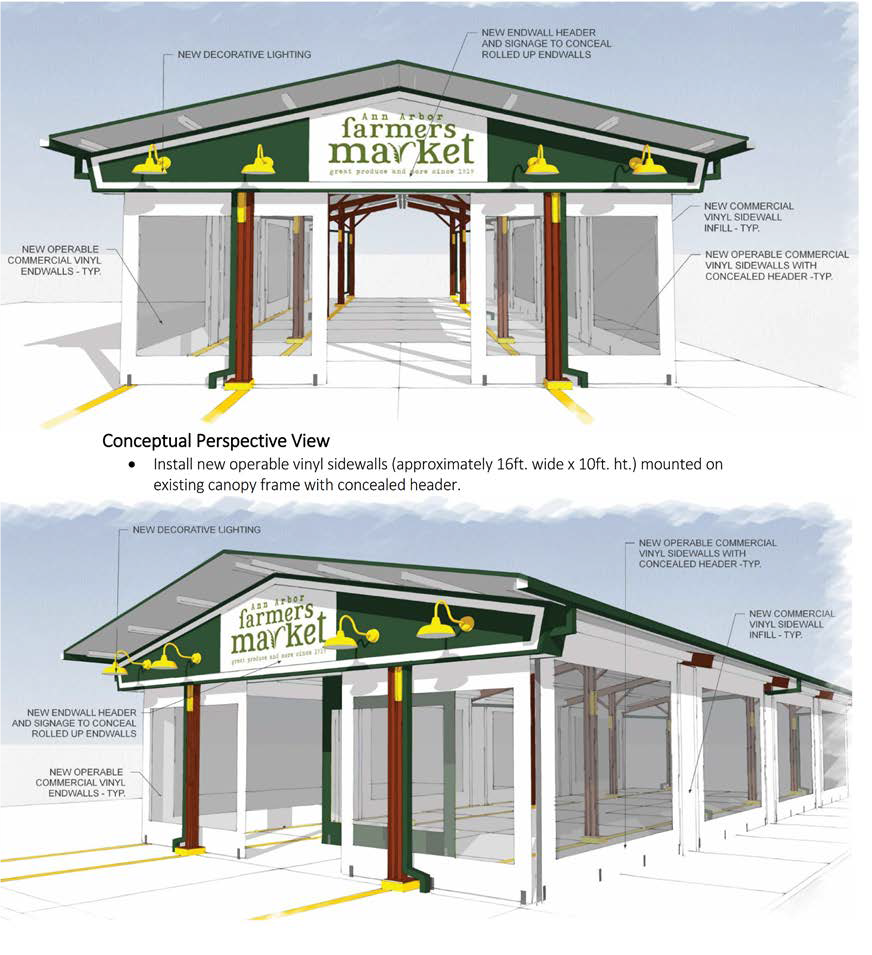 Proposed infrastructure improvements for the Ann Arbor Farmers Market focus on a new market structure to expand vendor stall capacity year-round. The project is intended to improve the experience for all users as the market evolves, continues to provide a critical outlet for local food and serves as a central community gathering space throughout the year. The market project first identified in the City's Capital Improvement Plan highlighted the need to improve winter capacity at the Farmers Market. This project is intended to realize improved stall space for the market's vendors in all seasons. The project reflects the priorities of the Public Market Advisory Commission, which has advocated for the expansion and improvement of market infrastructure for winter purposes. Parks & Recreation Services is committed to improving this park space within the downtown area of the City of Ann Arbor. Feedback and questions can be sent directly to the Public Market Advisory Commission, pmac@a2gov.org. All emails regarding the project will filed as part of the public record for this project.