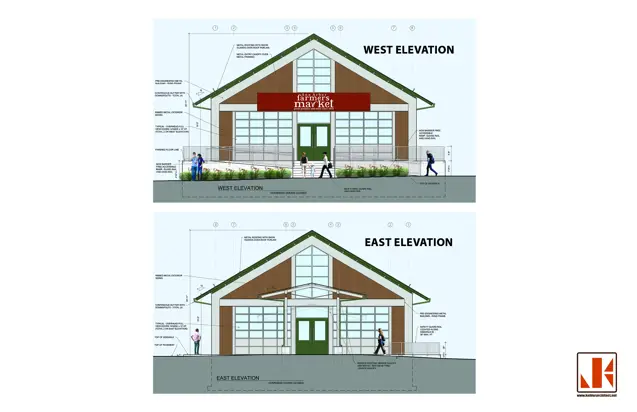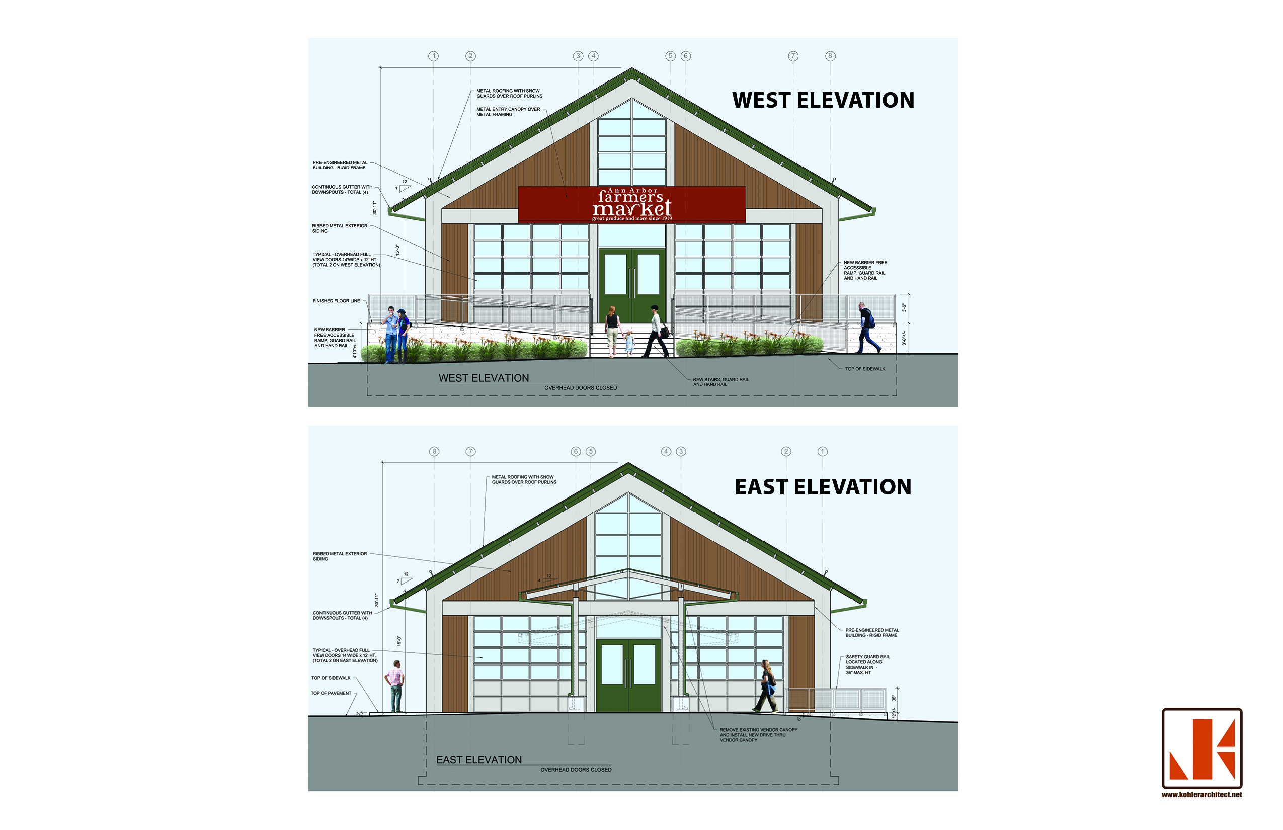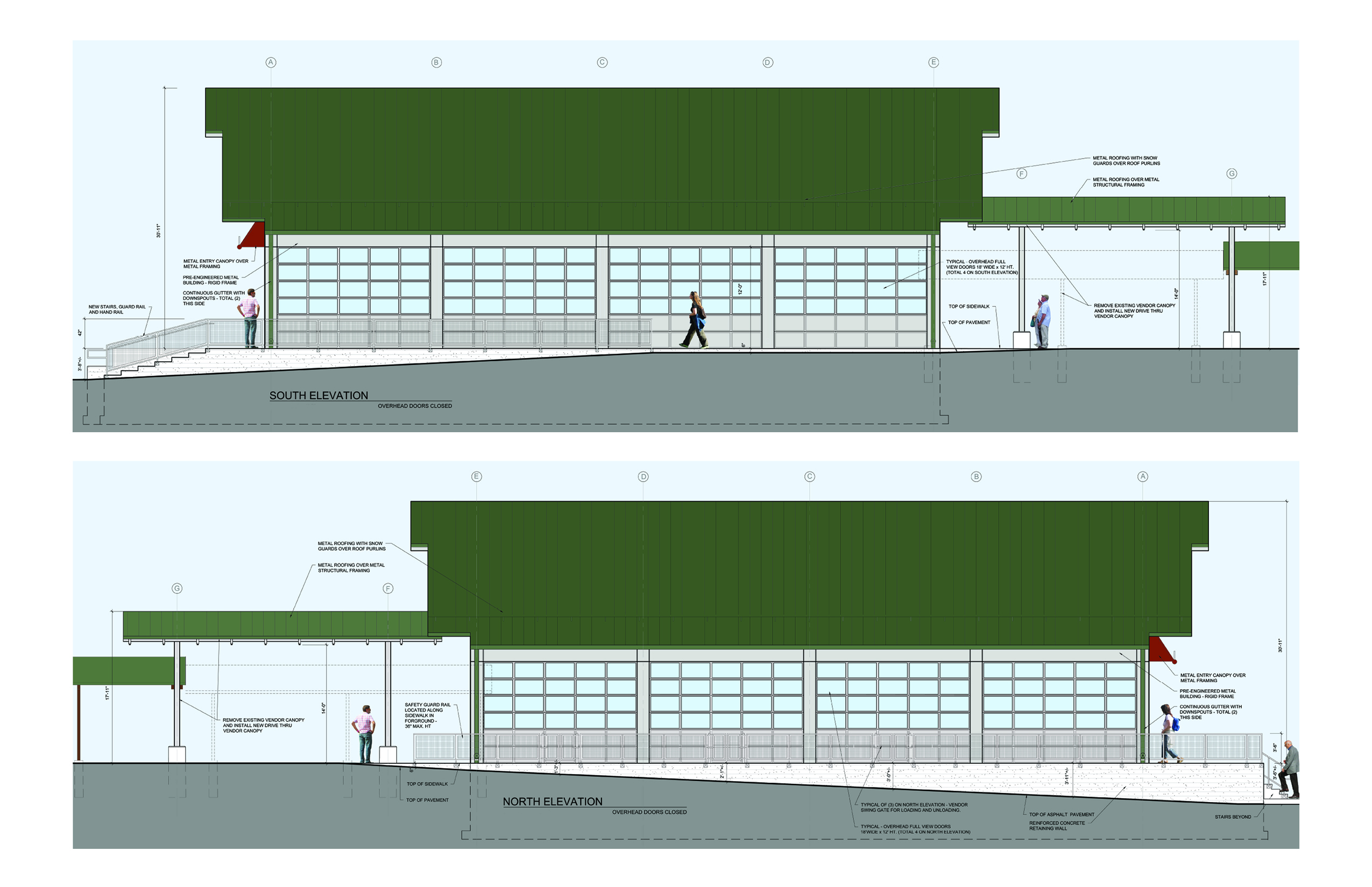 The above elevation drawings reflect input from vendor and community operations committee members, the Public Market Advisory Commission, staff, the architect and engineers. Current estimates based upon vendor input provide for 36 stalls inside the new structure, providing 16 new stalls to the overall capacity of the market and 36 full-enclosed stalls for winter use.