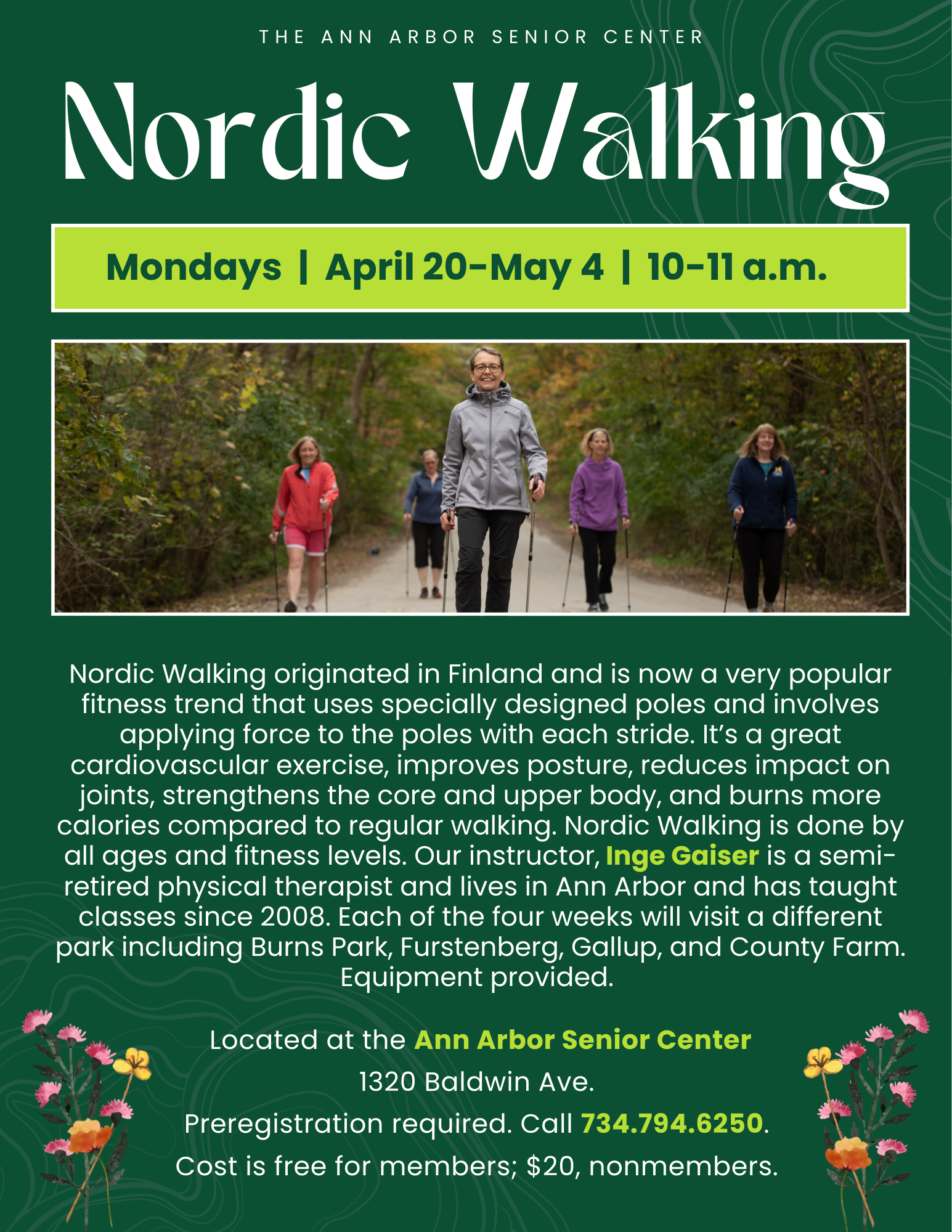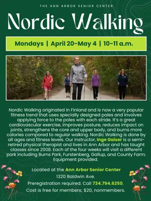 Nordic Walking originated in Finland and is now a very popular fitness trend that uses specially designed poles and involves applying force to the poles with each stride. It’s a great cardiovascular exercise, improves posture, reduces impact on joints, strengthens the core and upper body, and burns more calories compared to regular walking. Nordic Walking is done by all ages and fitness levels. Our instructor, Inge Gaiser is a semi-retired physical therapist and lives in Ann Arbor and has taught classes since 2008. Each of the four weeks will visit a different park including Burns Park, Furstenberg, Gallup, and County Farm. Equipment provided. The first class will meet at the Burns Park Shelter, 1300 Baldwin Ave. (across the park from the Senior Center). The last three classes will meet at different parks. Preregistration required. Click here to register or call 734.794.6250. Cost is free for members; $20, nonmembers.
