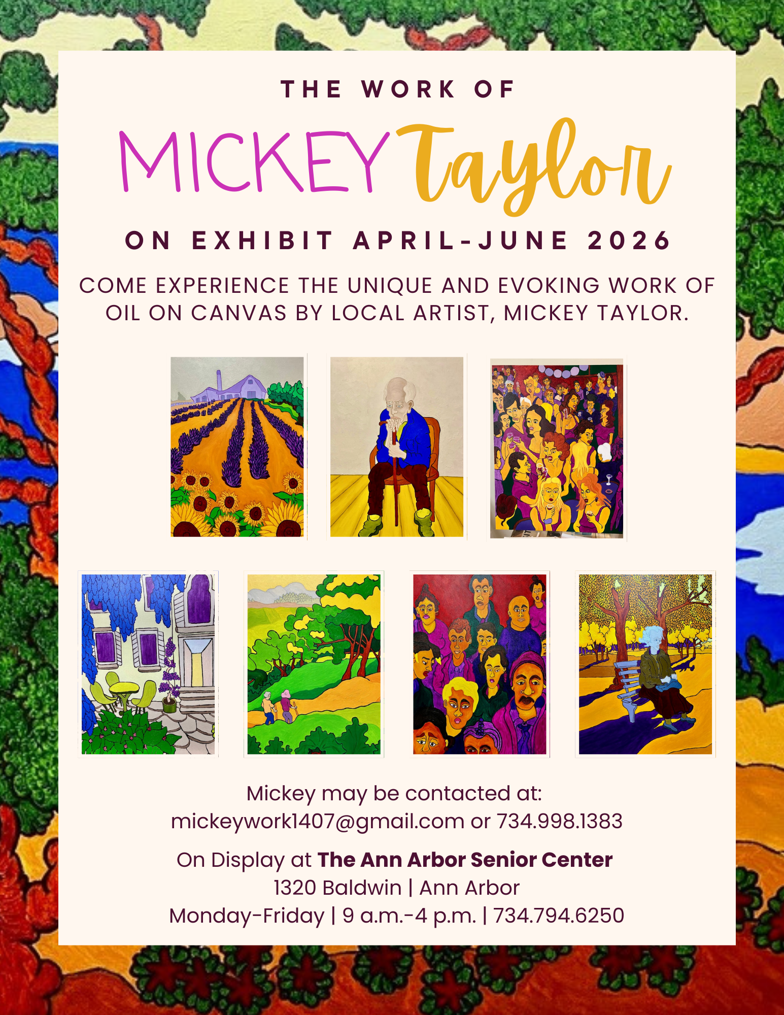Come enjoy the energetic work of Mickey Taylor who shares a colorful collection of oil paintings. He shares that he used to be a professor of neuropsychiatry. Now he considers himself an octogenarian (old guy) that paints. He's self-taught and likes bright colors. He has no overarching painting philosophy. He paints places he knows, mainly the states of Montana, and Michigan and the people in his paintings reflect the human condition (old folks and people in bars). Located at the Ann Arbor Senior Center, 1320 Baldwin Ave. Call 734.794.6250. Free of charge.