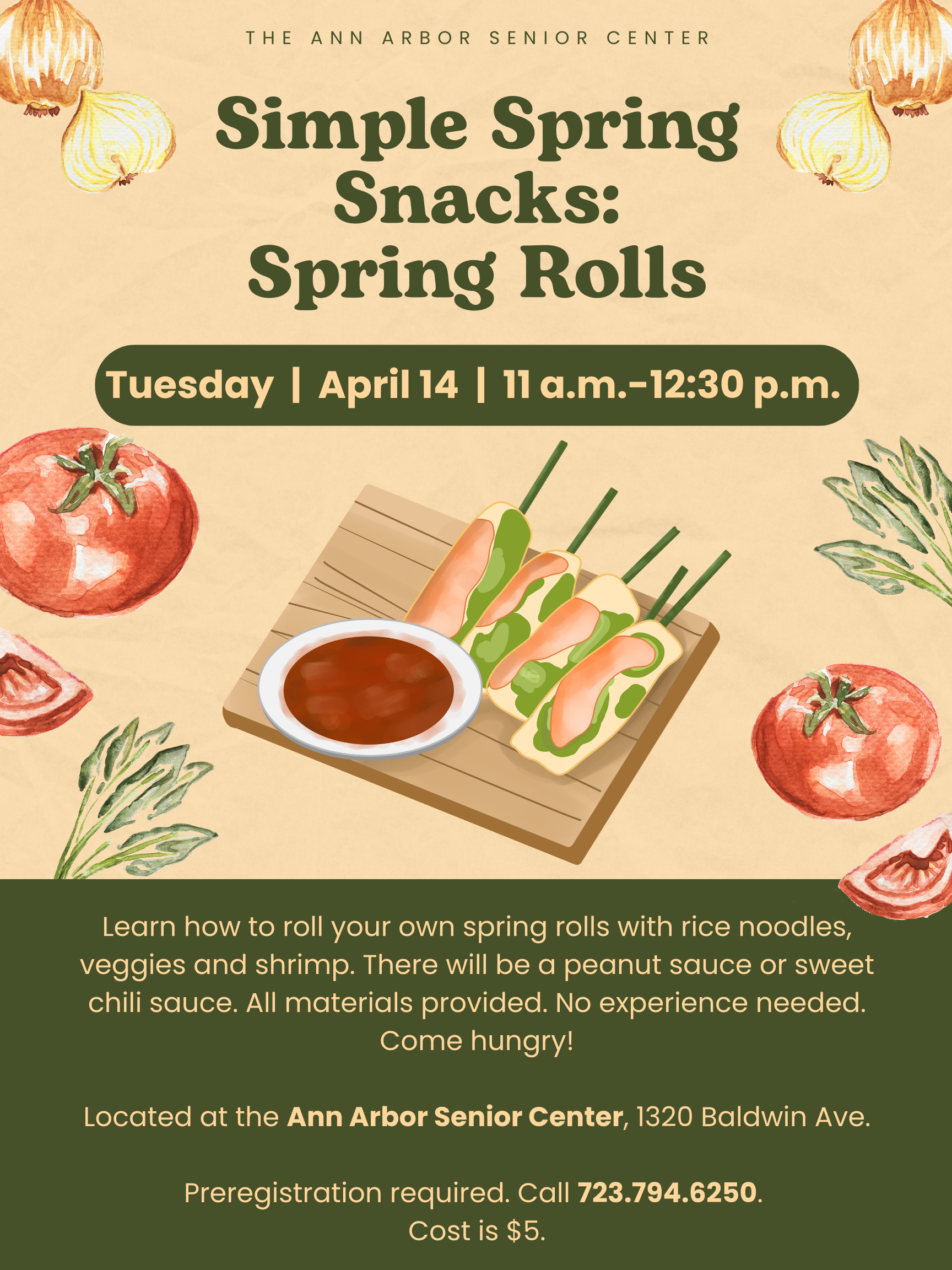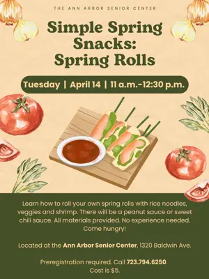 Learn how to roll your own spring rolls with rice noodles, veggies, and shrimp. There will be a peanut sauce or sweet chili sauce too. All materials provided. No experience needed. Come hungry! Located at the Ann Arbor Senior Center, 1320 Baldwin Ave. Preregistration required. Click here or call 723.794.6250. Cost is $5.