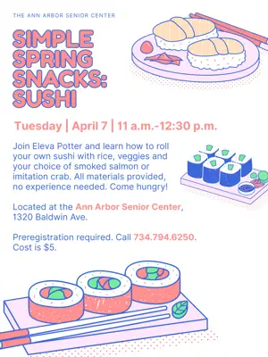 Join Eleva Potter and learn how to roll your own sushi with rice, veggies and your choice of smoked salmon or imitation crab. All materials provided, no experience needed. Come hungry! Located at the Ann Arbor Senior Center, 1320 Baldwin Ave. Preregistration required. Click here or call 734.794.6250. Cost is $5.