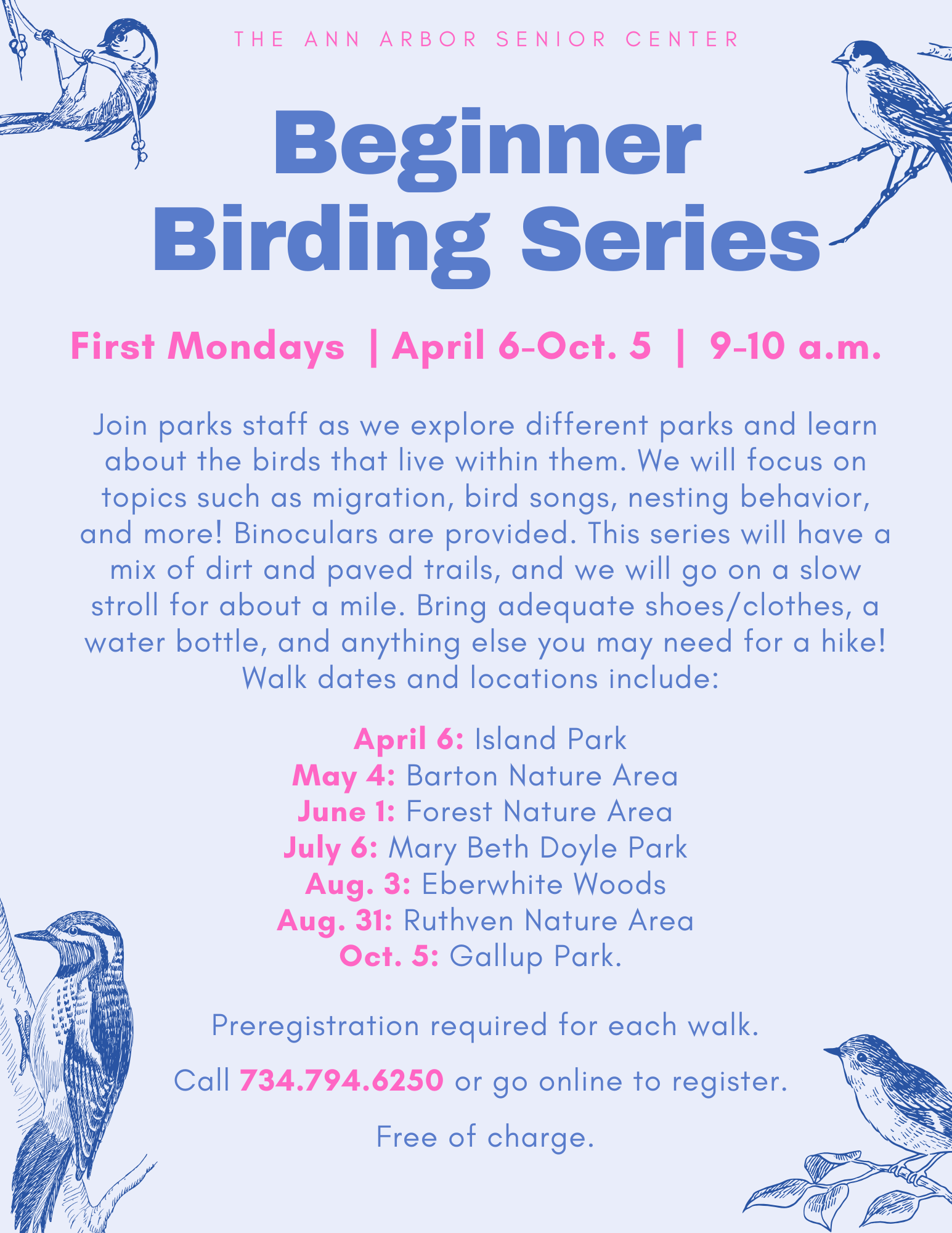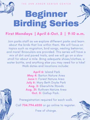 Join parks staff as we explore different parks and learn about the birds that live within them. We will focus on topics such as migration, bird songs, nesting behavior, and more! Binoculars are provided. This series will have a mix of dirt and paved trails, and we will go on a slow stroll for about a mile. Bring adequate shoes/clothes, a water bottle, and anything else you may need for a hike! Walk dates and locations include: April 6: Island Park; May 4: Barton Nature Area; June 1: Forest Nature Area; July 6: Mary Beth Doyle Park; Aug. 3: Eberwhite Woods; Aug. 31: Ruthven Nature Area; Oct. 5: Gallup Park. Preregistration required for each walk. Click walk dates to register or call 734.794.6250. Free of charge.