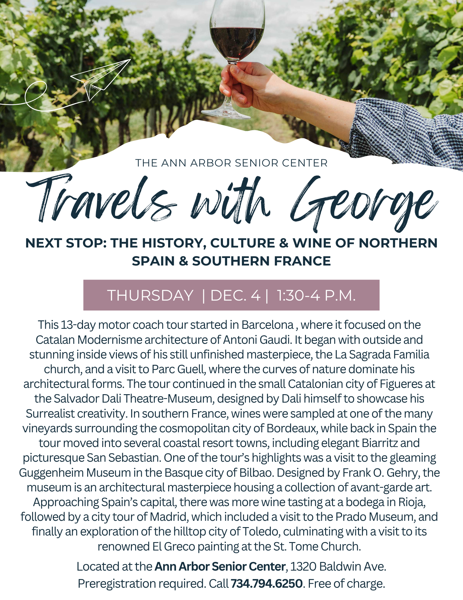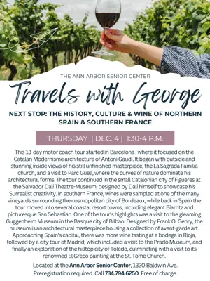 Join us on a travelogue with host George Jabol! This 13-day motor coach tour started in Barcelona , where it focused on the Catalan Modernisme architecture of Antoni Gaudi. It began with outside and stunning inside views of his still unfinished masterpiece, the La Sagrada Familia church, and a visit to Parc Guell, where the curves of nature dominate his architectural forms. The tour continued in the small Catalonian city of Figueres at the Salvador Dali Theatre-Museum, designed by Dali himself to showcase his Surrealist creativity. In southern France, wines were sampled at one of the many vineyards surrounding the cosmopolitan city of Bordeaux, while back in Spain the tour moved into several coastal resort towns, including elegant Biarritz and picturesque San Sebastian. One of the tour’s highlights was a visit to the gleaming Guggenheim Museum in the Basque city of Bilbao. Designed by Frank O. Gehry, the museum is an architectural masterpiece housing a collection of avant-garde art. Approaching Spain’s capital, there was more wine tasting at a bodega in Rioja, followed by a city tour of Madrid, which included a visit to the Prado Museum, and finally an exploration of the hilltop city of Toledo, culminating with a visit to its renowned El Greco painting at the St. Tome Church. Open to all ages 18+. Located at the Ann Arbor Senior Center, 1320 Baldwin Ave. Preregistration required. Click here to register or call 734.794.6250. Free of charge.
