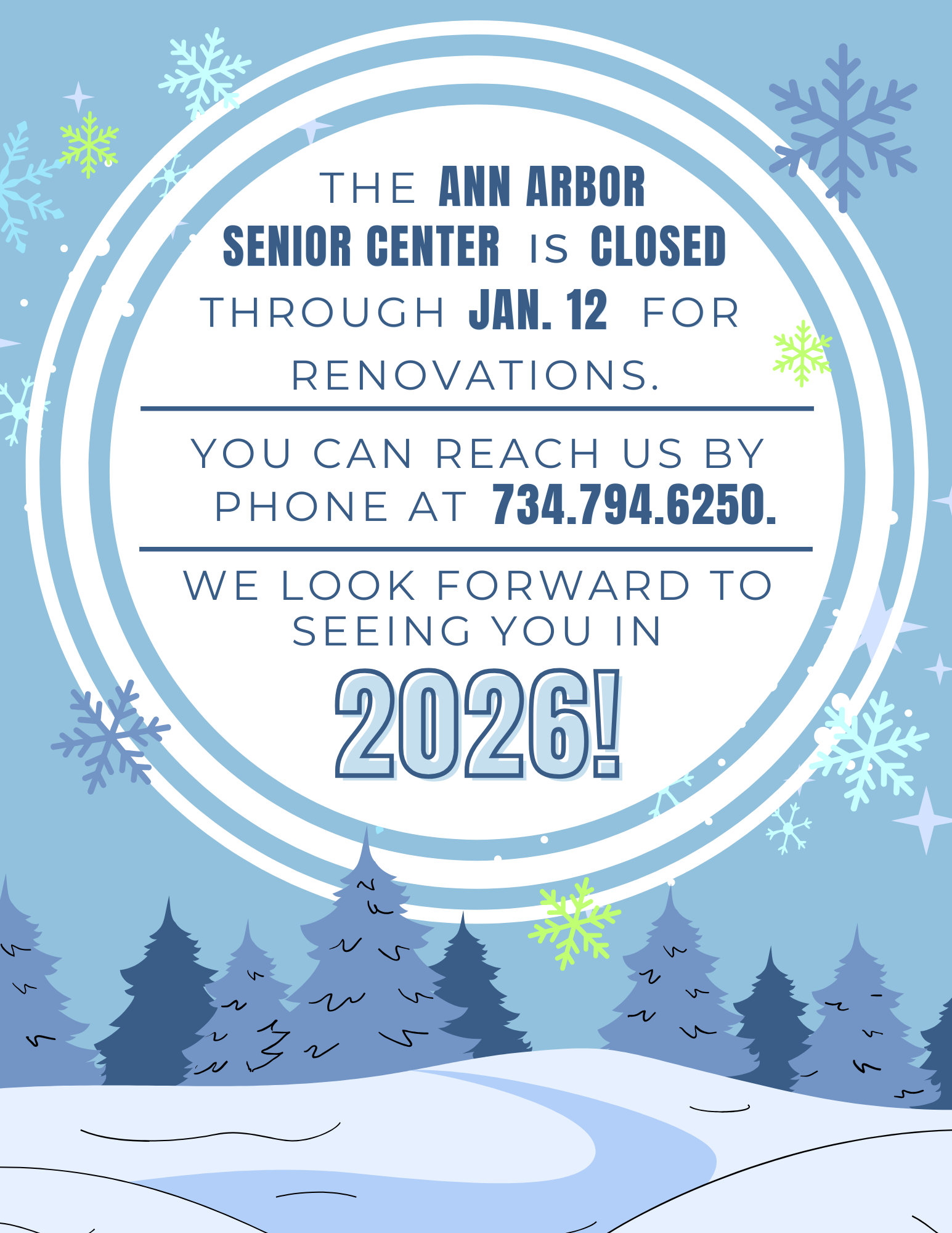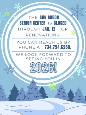 The Ann Arbor Senior Center is closed for renovations through Monday, Jan. 12. There are additional Zoom activities available the first week of the year, scroll down to learn more and sign up!