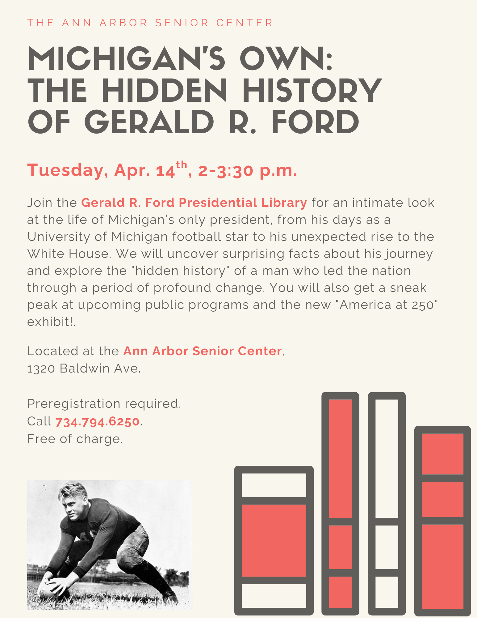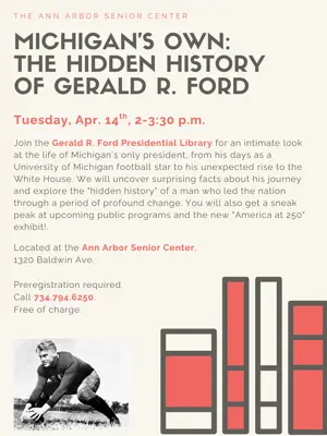 Join the Gerald Ford Presidential Library for an intimate look at the life of Michigan’s only president, from his days as a University of Michigan football star to his unexpected rise to the White House. We will uncover surprising facts about his journey and explore the "hidden history" of a man who led the nation through a period of profound change. You will also get a sneak peek at upcoming public programs and the new "America at 250" exhibit at the Gerald R. Ford Presidential Library. Located at the Ann Arbor Senior Center, 1320 Baldwin Ave. Preregistration required. Click here or call 734.794.6250. Free of charge.