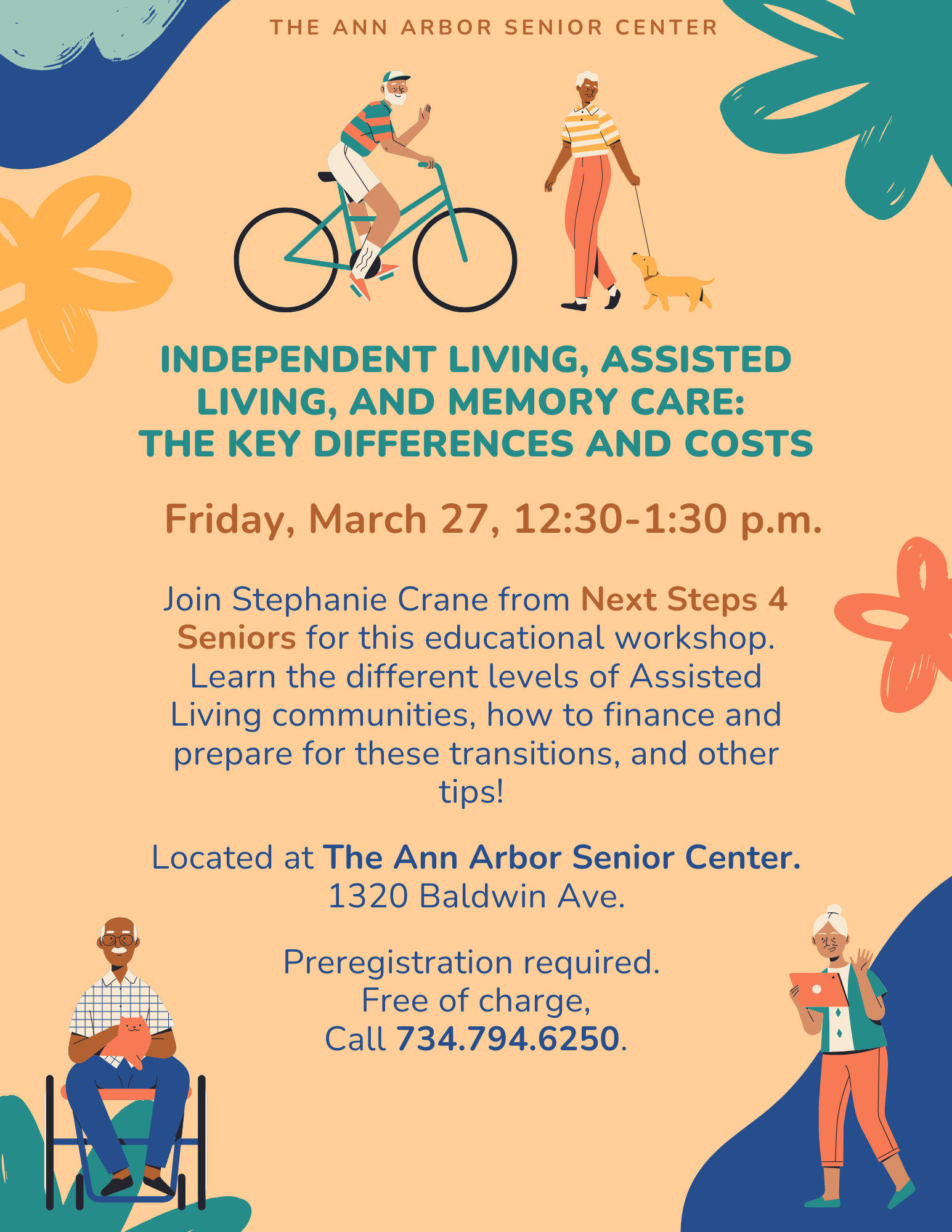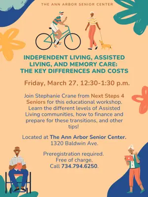 Join Stephanie Crane from Next Steps 4 Seniors for this educational workshop. Learn the different levels of assisted living communities; how to finance and prepare for these transitions; and other tips! Located at the Ann Arbor Senior Center, 1320 Baldwin Ave. Preregistration required. Click here or call 734.794.6250. Free of charge.
