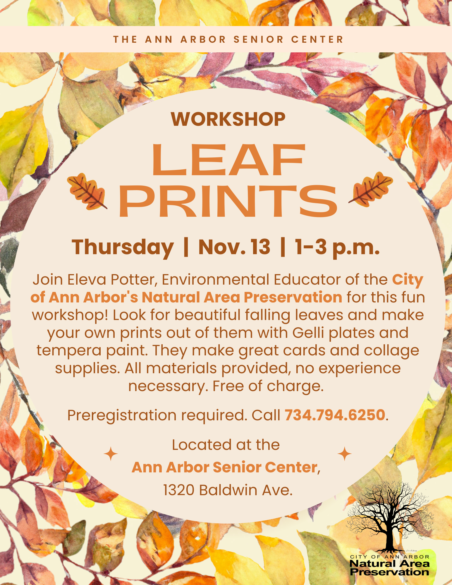 Join Eleva Potter, Environmental Educator of the City of Ann Arbor's Natural Area Preservation for this fun workshop! Look for beautiful falling leaves and make your own prints out of them with Gelli plates and tempera paint. They make great cards and collage supplies. All materials are provided, no experience necessary. Located at the Ann Arbor Senior Center, 1320 Baldwin Ave. Preregistration required. Click here or call 734.794.6250. Free of charge.