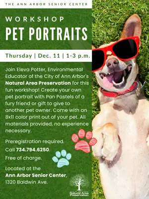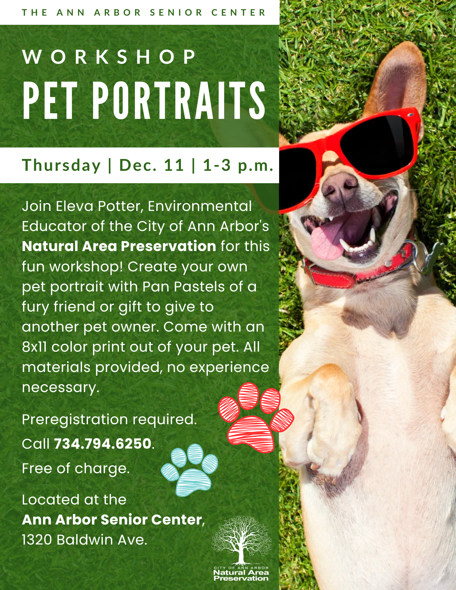 Join Eleva Potter, Environmental Educator of the City of Ann Arbor's Natural Area Preservation for this fun workshop! Create your own pet portrait with Pan Pastels of a fury friend or gift to give to another pet owner. Come with an 8x11 color print out of your pet. All materials are provided, no experience necessary. Located at the Ann Arbor Senior Center, 1320 Baldwin Ave. Preregistration required. Click here or call 734.794.6250. Free of charge.