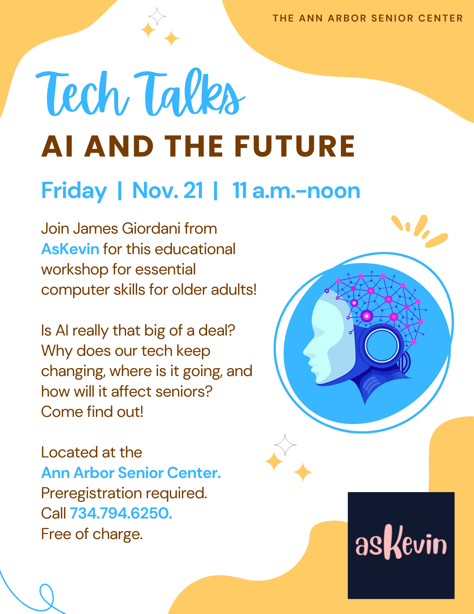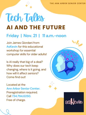 Is AI really that big of a deal? Why does our tech keep changing, where is it going, and how will it affect seniors? Come find out! Offered by AsKevin. James Giordani received his MSW from the University of Michigan with a focus on enhancing the quality of life and independence of seniors through technology. He has been teaching tech skills and providing in-home tech support tailored to older adults for over 8 years. James breaks down the confusing world of technology into clear, understandable, and interesting presentations whether you're a tech novice or a tech master. Located at the Ann Arbor Senior Center, 1320 Baldwin Ave. Preregistration required. Click here to register or call 734.794.6250. Free of charge.