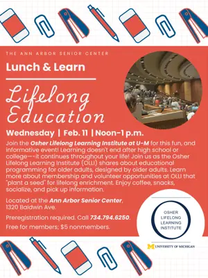 Join the Osher Lifelong Learning Institute at U-M for this fun, and informative event! Learning doesn't end after high school or college—-it continues throughout your life! Join us as the Osher Lifelong Learning Institute (OLLI) shares about educational programming for older adults, designed by older adults. Learn more about membership and volunteer opportunities at OLLI that "plant a seed" for lifelong enrichment. Enjoy coffee, snacks, socialize, and pick up information. Located at the Ann Arbor Senior Center, 1320 Baldwin Ave. Preregistration required. Click here or call 734.794.6250. Free for members; $5 nonmembers.