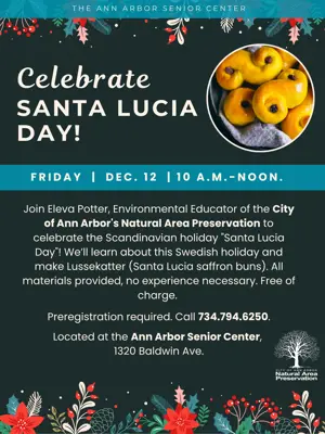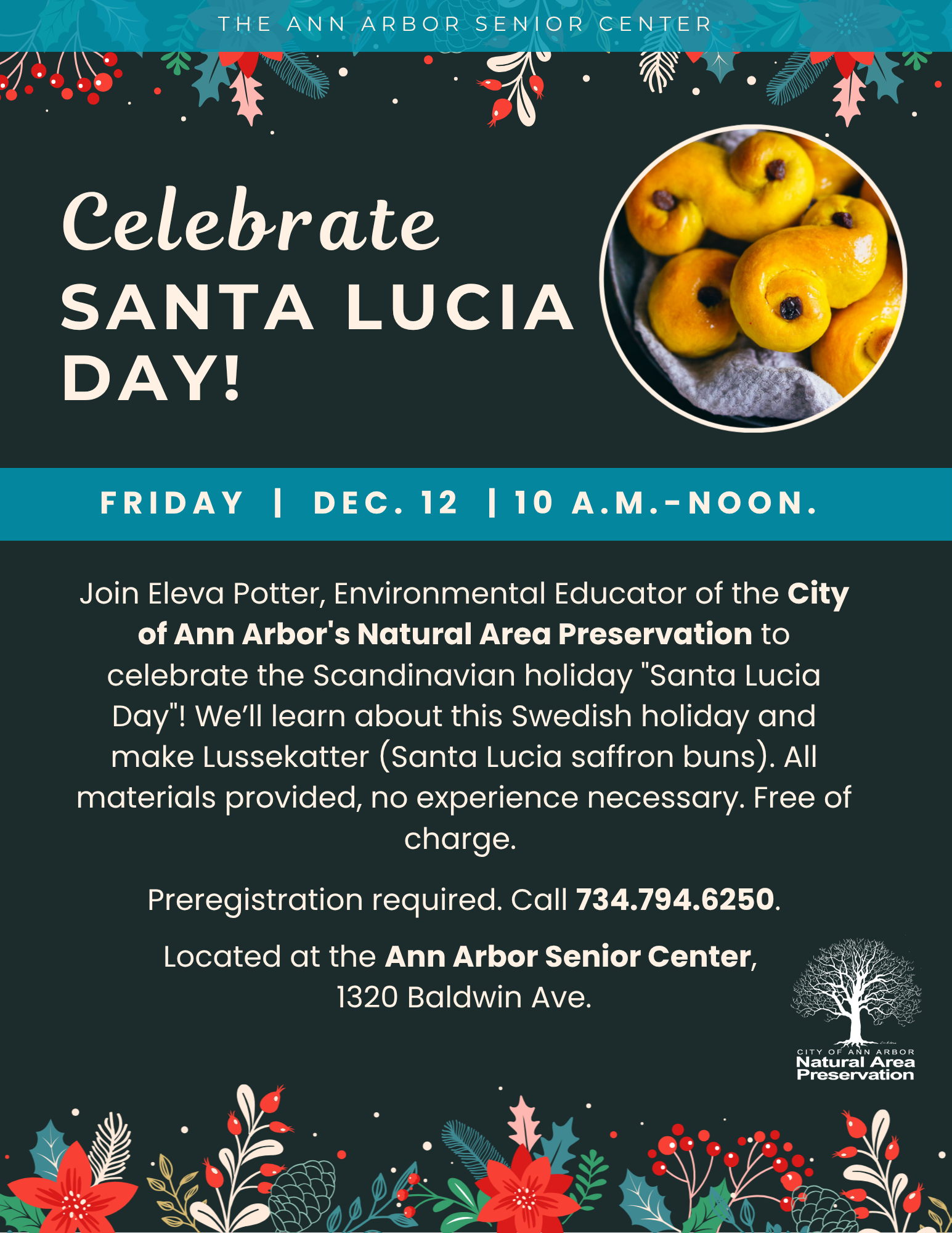 Join Eleva Potter, Environmental Educator of the City of Ann Arbor's Natural Area Preservation to celebrate the Scandinavian holiday "Santa Lucia Day"! We’ll learn about this Swedish holiday and make Lussekatter (Santa Lucia saffron buns). All materials are provided, no experience necessary. Located at the Ann Arbor Senior Center, 1320 Baldwin Ave. Preregistration required. Click here or call 734.794.6250. Free of charge.