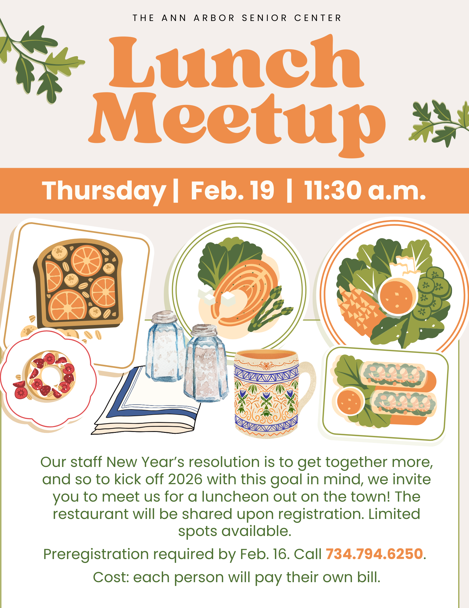 Our staff invites you to meet us for a luncheon out on the town! The restaurant will be shared upon registration. Limited spots available. Preregistration required by Feb. 13. Click here or call 734.794.6250. Cost: each person will pay their own bill.