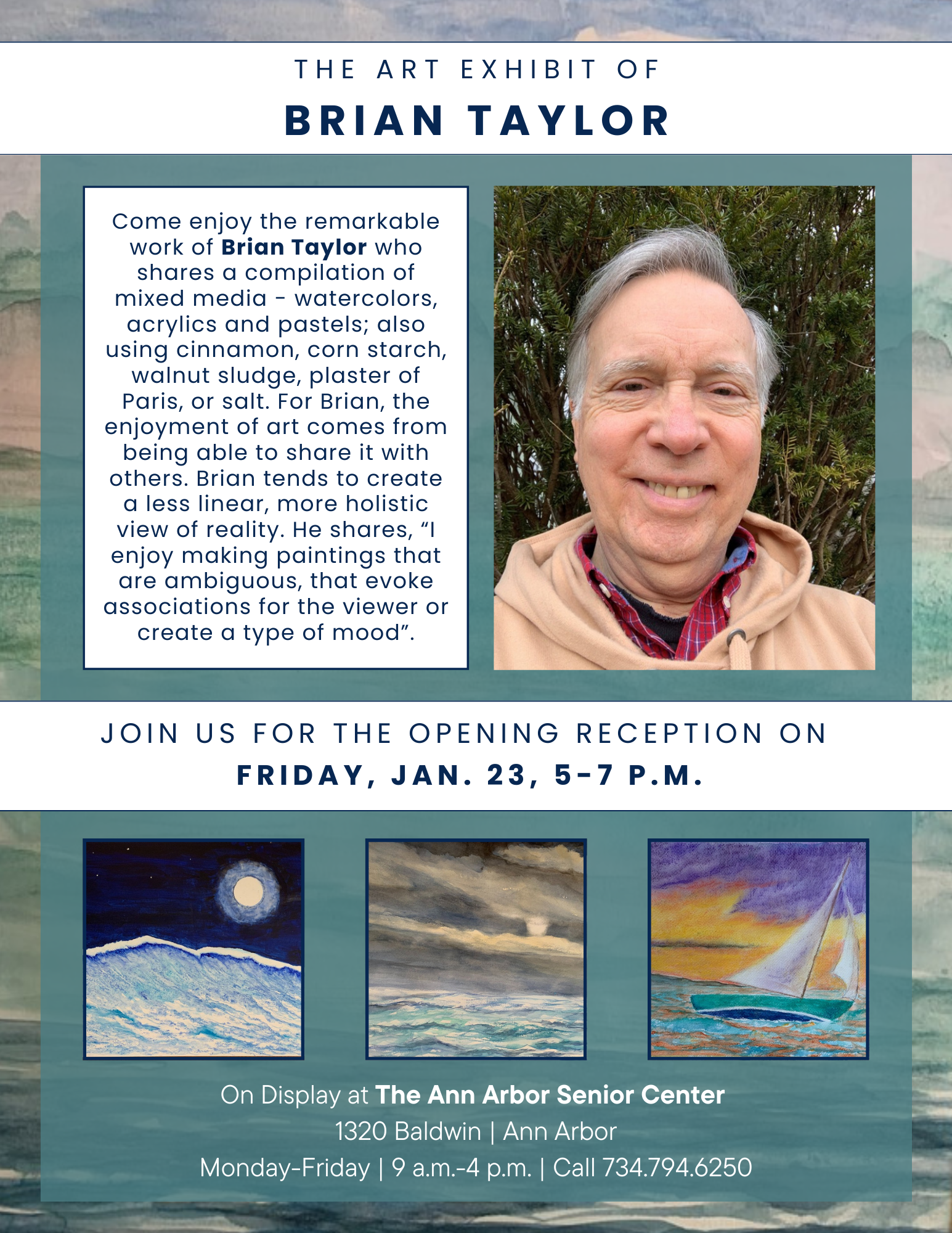 Opening reception Jan. 23, 5-7 p.m. Come enjoy the remarkable work of Brian Taylor who shares a compilation of mixed media - watercolors, acrylics and pastels; also using cinnamon, corn starch, walnut sludge, plaster of Paris, or salt. For Brian, the enjoyment of art comes from being able to share it with others. Brian tends to create a less linear, more holistic view of reality. He shares, “I enjoy making paintings that are ambiguous, that evoke associations for the viewer or create a type of mood”. Located at the Ann Arbor Senior Center, 1320 Baldwin Ave. Call 734.794.6250. Free of charge.