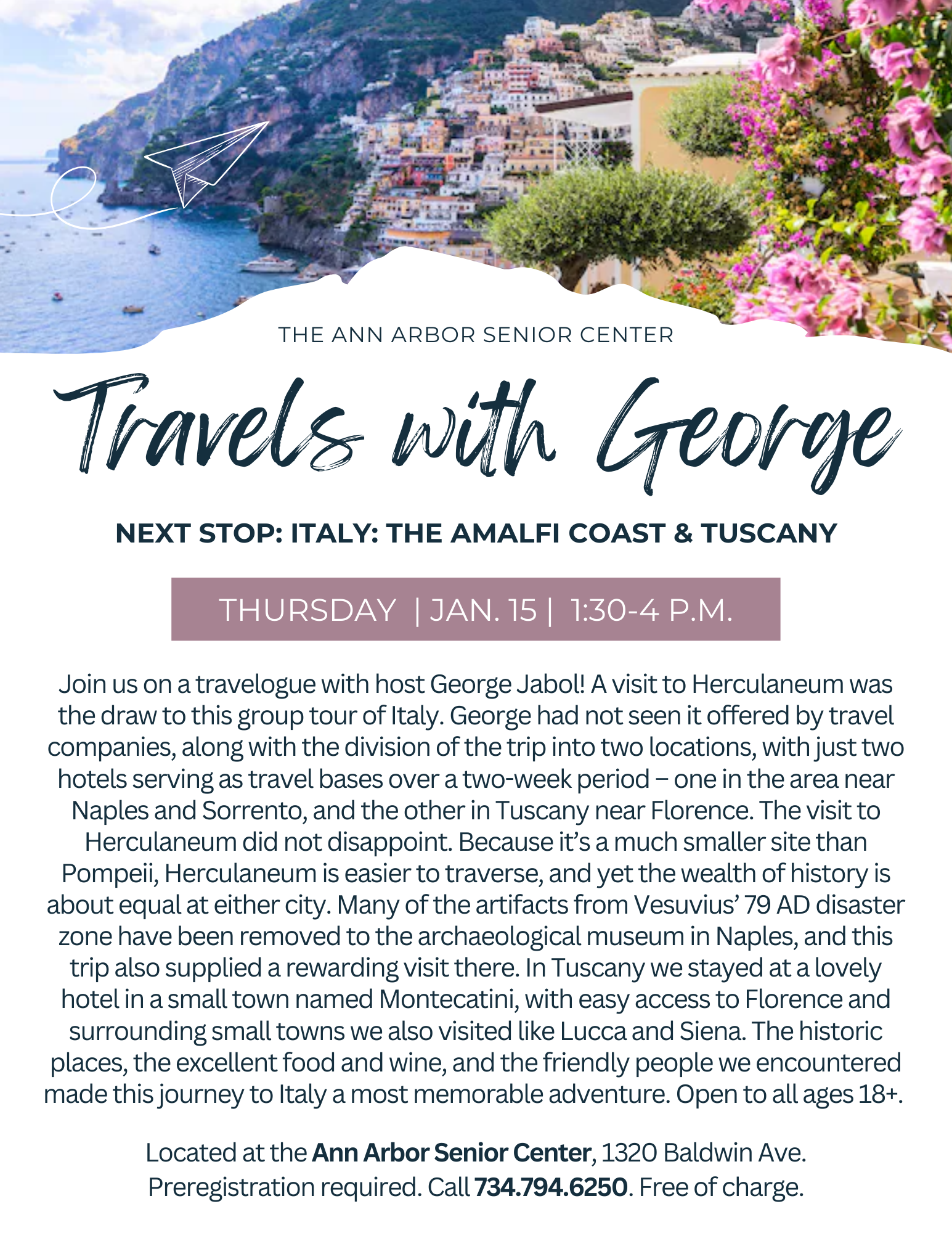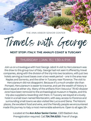 Join us on a travelogue with host George Jabol! A visit to Herculaneum was the draw to this group tour of Italy. George had not seen it offered by travel companies, along with the division of the trip into two locations, with just two hotels serving as travel bases over a two-week period – one in the area near Naples and Sorrento, and the other in Tuscany near Florence. The visit to Herculaneum did not disappoint. Because it’s a much smaller site than Pompeii, Herculaneum is easier to traverse, and yet the wealth of history is about equal at either city. Many of the artifacts from Vesuvius’ 79 AD disaster zone have been removed to the archaeological museum in Naples, and this trip also supplied a rewarding visit there. In Tuscany we stayed at a lovely hotel in a small town named Montecatini, with easy access to Florence and surrounding small towns we also visited like Lucca and Siena. The historic places, the excellent food and wine, and the friendly people we encountered made this journey to Italy a most memorable adventure. Open to all ages 18+. Located at the Ann Arbor Senior Center, 1320 Baldwin Ave. Preregistration required. Click here to register or call 734.794.6250. Free of charge.
