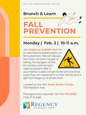 Join Regency at Bluffs Park for our February Brunch & Learn for an educational presentation on fall prevention. We will discuss the most common causes of falling, the dangers of falls for seniors, and the best ways to prevent falls in your home. Guests will go home with practical tools they can implement in their homes and a gift from Regency at Bluffs Park for their participation. Located at the Ann Arbor Senior Center, 1320 Baldwin Ave. Preregistration required. Click here to register or call 734.794.6250. Free of charge.