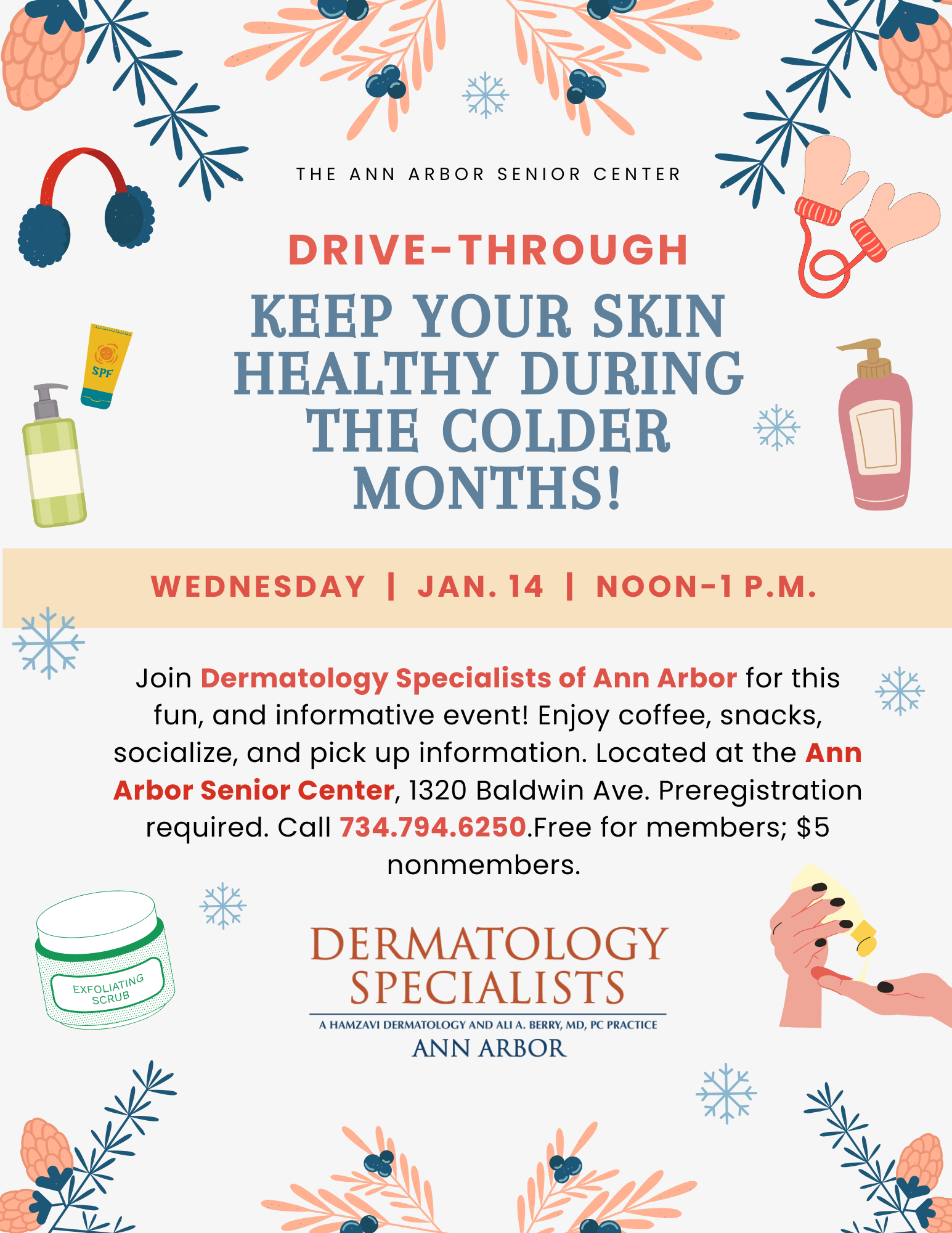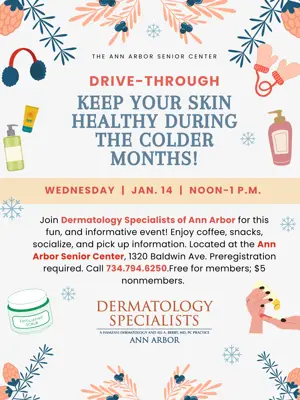 Join Dermatology Specialists of Ann Arbor for this fun, and informative event! Enjoy coffee, snacks, socialize, and pick up  goodie bags. A staff member will be doing a talk on a topic of winter skin with Dr. Cody Funkhouser! Located at the Ann Arbor Senior Center, 1320 Baldwin Ave. Preregistration required. Click here or call 734.794.6250. Free for members; $5 nonmembers.