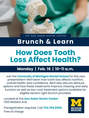 Join the University of Michigan Dental School for this new presentation! We'll learn how tooth loss affects nutrition, overall health, and confidence. We'll also discuss denture options and how these treatments improve chewing and daily function as well as low-cost treatment options available for eligible seniors  Light brunch provided. Located at the Ann Arbor Senior Center, 1320 Baldwin Ave. Preregistration required. Click here to register or call 734.794.6250. Free of charge.