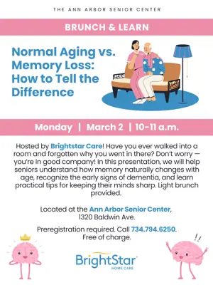 Hosted by Brightstar Care! Have you ever walked into a room and forgotten why you went in there? Don’t worry — you’re in good company! In this presentation, we will help seniors understand how memory naturally changes with age, recognize the early signs of dementia, and learn practical tips for keeping their minds sharp. Light brunch provided. Located at the Ann Arbor Senior Center, 1320 Baldwin Ave. Preregistration required. Click here to register or call 734.794.6250. Free of charge.
