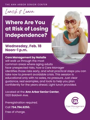 Care Management by Natalie will be back in 2026 with a new Lunch & Learn focused on helping you stay independent for as long as possible. We’ll walk through the most common areas where aging adults face unexpected risks, how a Care Manager identifies those risks early, and what practical steps you can take now to prevent avoidable crisis. This session is educational only with no sales, no pressure. Just clear guidance, real examples, and tools to help you plan confidently for the years ahead. Light lunch provided. Located at the Ann Arbor Senior Center, 1320 Baldwin Ave. Preregistration required. Click here or call 734.794.6250. Free of charge.