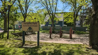 This site was an abandoned gas station which was purchased by the City of Ann Arbor in 1974 in order to create a park. It was referred to as the Packard/Arch Park until 1980 when it was renamed for Franklin C. Forsythe. Forsythe was the founder and the first president of the Ann Arbor Jaycees. The site was acquired using a HUD (federal) grant for “in-city parks." The design was a cooperative effort between the city Parks and Recreation unit, the Jaycees and the Burns Park Community Association. The park has been adopted by the Ann Arbor Jaycees and several members of the Jaycees spearheaded the drive to name the park after Forsythe. He was at the ribbon cutting in 1980, a year before he died.