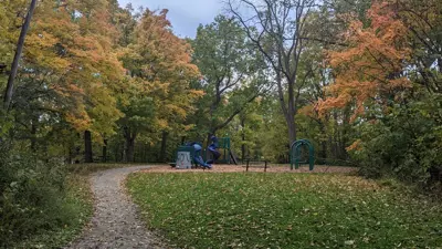 Fritz Park is a 5-acre gem on Pauline, between Seventh Street and Stadium Boulevard. View the Ann Arbor Parks and Nature Areas map for location context. The park is a connector to the larger Eberwhite Woods and Eberwhite Nature Area and creates a pleasant walk through the woods. Its ecosystem consists of mature oak-hickory woodland with an understory of diverse, native, ground flora. Near the middle of the park is a small mowed area with a playground. The park contains a play structure, picnic tables and grills. The play area in the middle of the park is surrounded by tall trees providing plenty of shade.