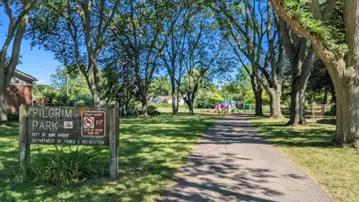 Pilgrim Park was acquired by the city in 1960 as the surrounding neighborhood was developed. The land was given to the city by the developer, as new developments at the time had a requirement to include some dedicated park land. The paved asphalt path into the park was constructed in 2009.