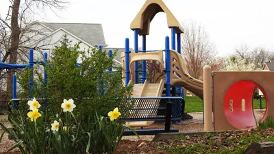 The developed area features a playground, a garden, and a mowed open field. Parents and caregivers can watch children from the nearby benches or from the perimeter sidewalk. The playground features an accessible swing. The garden features shade trees as well as three-season flowering perennials, including daffodils, irises, daisies, sun drops, sedums, and fountain grasses. Two picnic tables and a grill are also available.