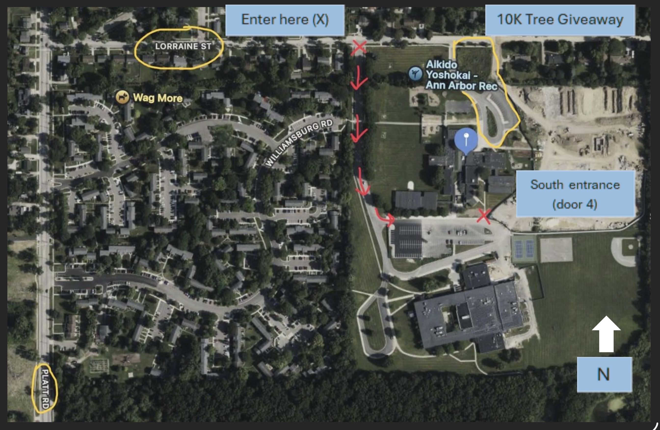 NOTE: Another event, the 10K Trees FreeTree Giveaway, will be taking place in the north parking lot of Mitchell Elementary from 10am -4pm. To ensure both this event and the Teach-In run smoothly, please do not enter or park in the north lot (circled in yellow on the map). Enter at the Scarlett Elementary School sign / driveway.