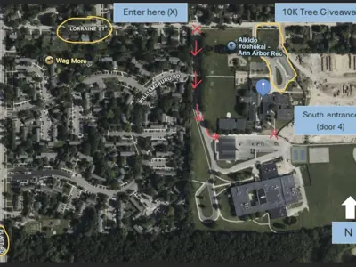 This driveway leads to the parking lot just south of the school; follow signage and (weather permitting) event staff that are directing traffic to the back entrance. Also look for A2ZERO banners and A-frame signs at the school’s south entrance.