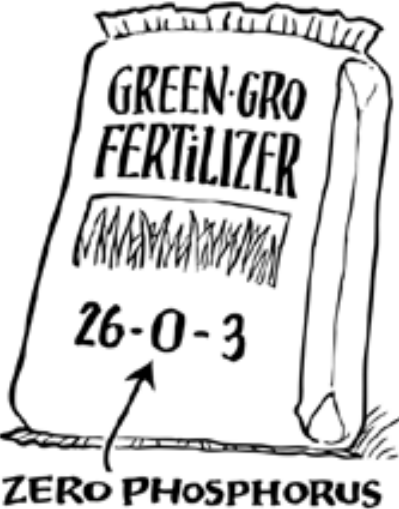 Phosphorus-free fertilizer is effective and readily available from major lawn care product manufacturers and distributors. When purchasing fertilizer, check the label on the bag, where you will see a series of three numbers. The first number indicates nitrogen, which is used to promote top growth. The middle number indicates phosphorus, which is used for root growth. The last number indicates potassium, for strong stems and disease resistance. To comply with the ordinance, the middle number in the series of three numbers on the fertilizer bag must read “0,” which means there is no phosphorus in the product. In general, check the turf grass fertilizers for zero phosphorus and avoid “lawn and garden” fertilizers, which are very high in phosphorus.
